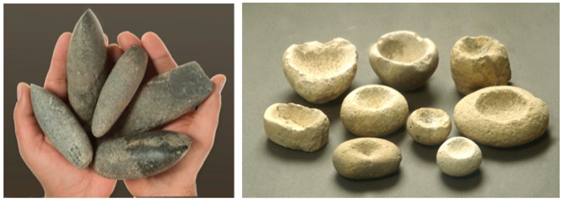 Above we can see some items from the Pre-Pottery Neolithic A period. In the drawing we have stone tools from the Levant, (a) and (b) are El-Khiam (see Khiamian period) projectile points, (c) and (d) are HaGdud truncations, (e) is a borer/awl, (f) a knife, (g) a cuphole, (h) a polished axe, and (i) and (j) shaft straighteners. The photographs below are of basalt axes and stone bowls.