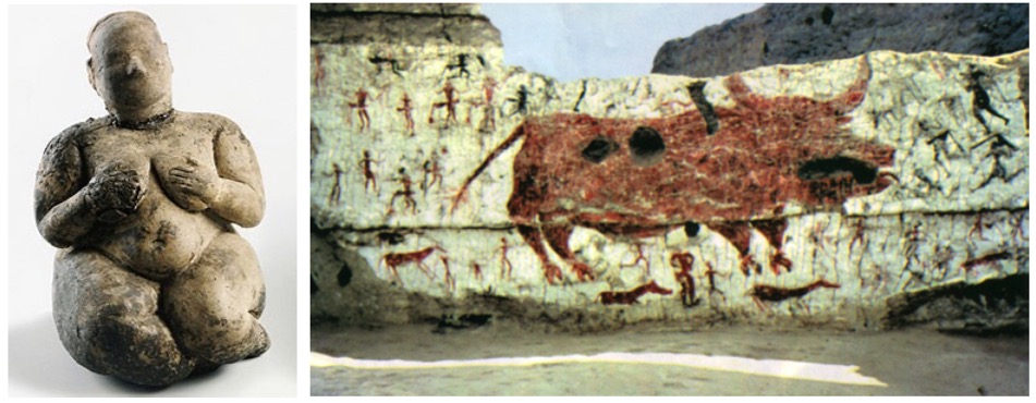 The bull was certainly a subject of some veneration well before ca. 15,000 years ago. The bull and bison are to be found in almost all cave painting collections, e.g. in the Cave of Altamira. It is possible that some form of bull worship started in those caves. We know that a bull cult existed in Çatalhöyük in Anatolia ca. 7000 BC. There are bull shrines that simulate cave settings, and some even include bull-leaping. The female figurines (possibly later to become recognised as deities) are striking, being carved from marble, blue and brown limestone, schist, calcite, basalt, alabaster, and clay. But the vast majority of small figurines were of animals. Some of the bull paintings depict them being born from a Mother Goddess. Also the first stamp seals, possibly used for body and textile decoration, were also of bulls. In Mesopotamia the bull would develop from an object of cult veneration to the 'Great Bull', a symbol of divinity. It is a major god character in the Epic of Gilgamesh, and the winged bull and winged lion were symbols of royal Babylonian power. Later still, with the Greeks and Romans, the bull would become associated with the Sun, and be the principle symbol of spring and regeneration (i.e. Zeus arrived in Crete in the form of a white bull). Oddly enough shrines throughout early history were often reminiscent of caves, which might suggest that caves and cave paintings might in fact have had some religious-ritual significance.